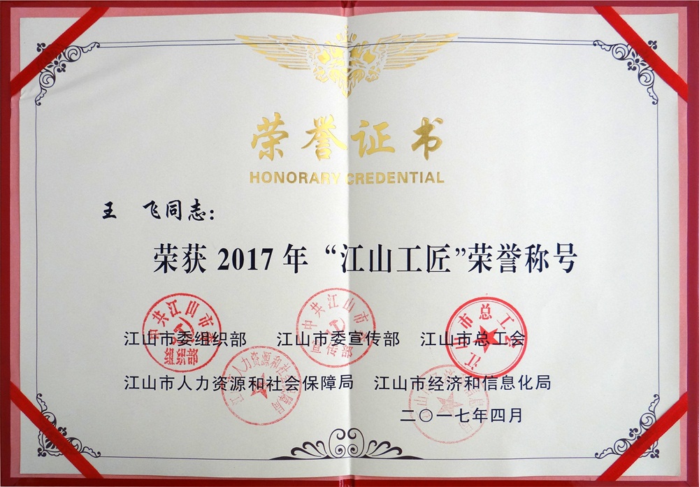 喜訊:我司員工王飛榮獲“江山工匠”榮譽(yù)稱號(hào)