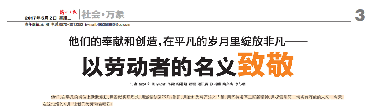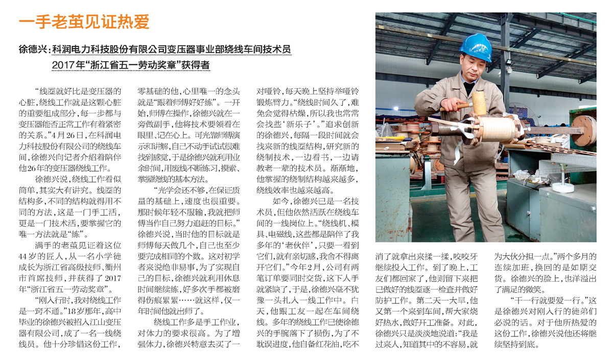 一手老繭見證熱愛(衢州日?qǐng)?bào)采訪我司 2017年“浙江省五一勞動(dòng)獎(jiǎng)?wù)隆鲍@得者徐德興)