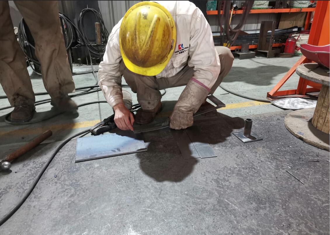 此次比武共有22名人員參加,分三個項目進行:1)電弧焊焊接,將兩塊300*70的2.0mm鋼板完成平面焊接。要求焊縫外形均勻,焊道與基本金屬之間過度平滑,焊道和飛濺物清理干凈且無氣孔咬邊夾渣。2)角焊,使用氣體保護焊將一節(jié)中?32圓管對焊焊接進一塊8mm帶孔鋼板。要求焊道外形均勻,焊道與基本金屬過度平滑,焊道和飛濺物清理干凈并無氣孔咬邊夾渣。焊道連接接弧處飽滿平順。3)氣割,將一8mmQ235板材氣割成均勻兩塊,要求表面粗糙度,切割面平面度,切口上緣融化程度,掛渣,缺陷的極限間距,直線度以及垂直度良好。最后以百分制為考核標準,評出一、二、三等獎。