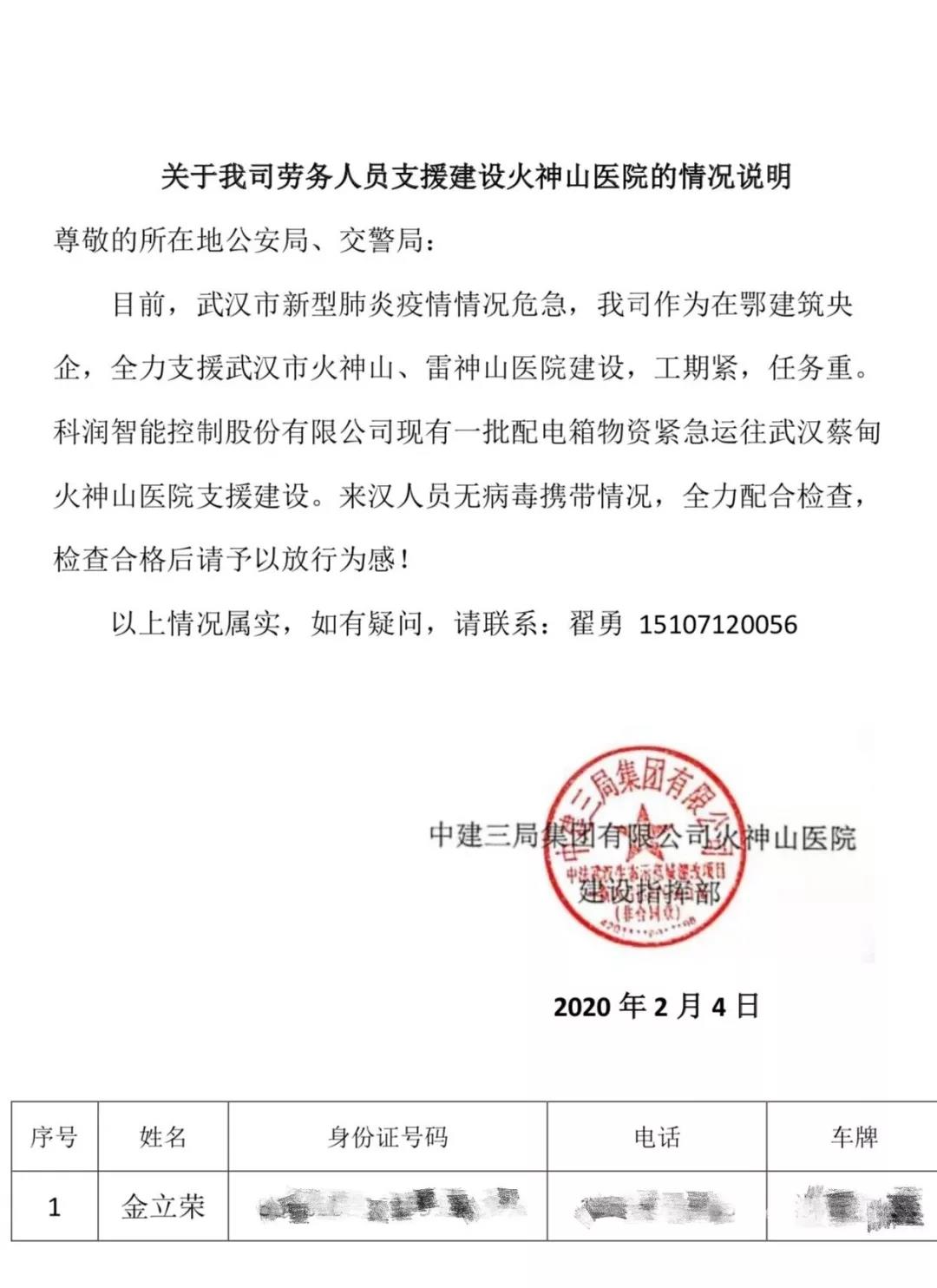 “設(shè)備現(xiàn)已被武漢方面接管,將立即運送至火神山醫(yī)院安裝?!?月5日,江山經(jīng)濟開發(fā)區(qū)科潤智能控制股份有限公司馳援火神山醫(yī)院的4套高低壓開關(guān)柜,已順利抵達武漢,正進行后續(xù)安裝調(diào)試。