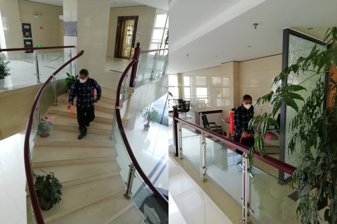 2020年2月9日上午,公司老黨員樂田光同志積極發(fā)揮黨員模范先鋒作用,用84消毒液對三個事業(yè)部的生產(chǎn)區(qū)域、辦公大樓、各辦公室、公共區(qū)域包括食堂、電梯、樓道、衛(wèi)生間以及停車場和車輛等進(jìn)行消毒,讓員工有個放心的工作環(huán)境,為復(fù)工保駕護(hù)航。