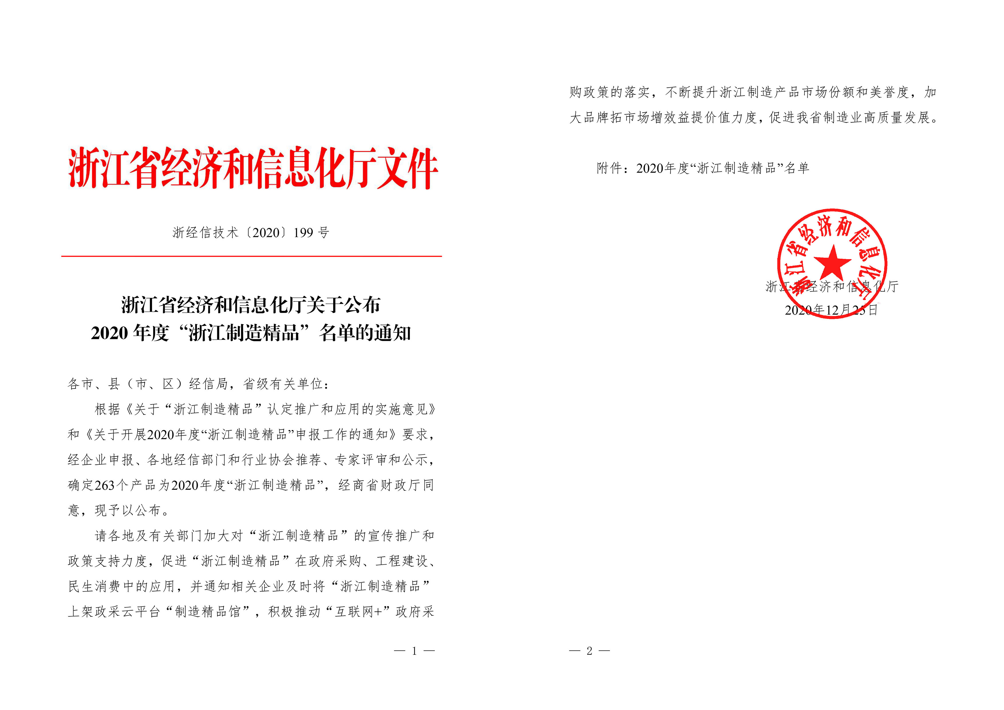 熱烈祝賀公司產(chǎn)品被浙江省經(jīng)信廳認(rèn)定為2020年度“浙江制造精品”!