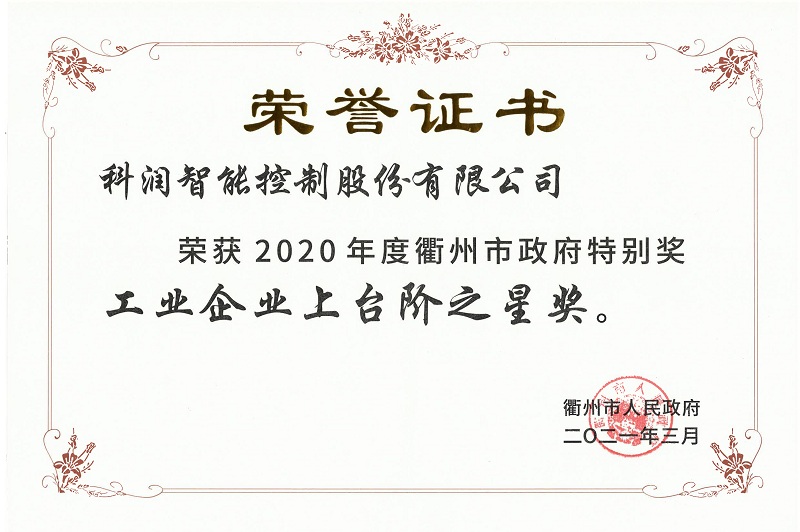 熱烈祝賀科潤智控榮獲衢州市政府特別獎“工業(yè)企業(yè)上臺階之星獎”!