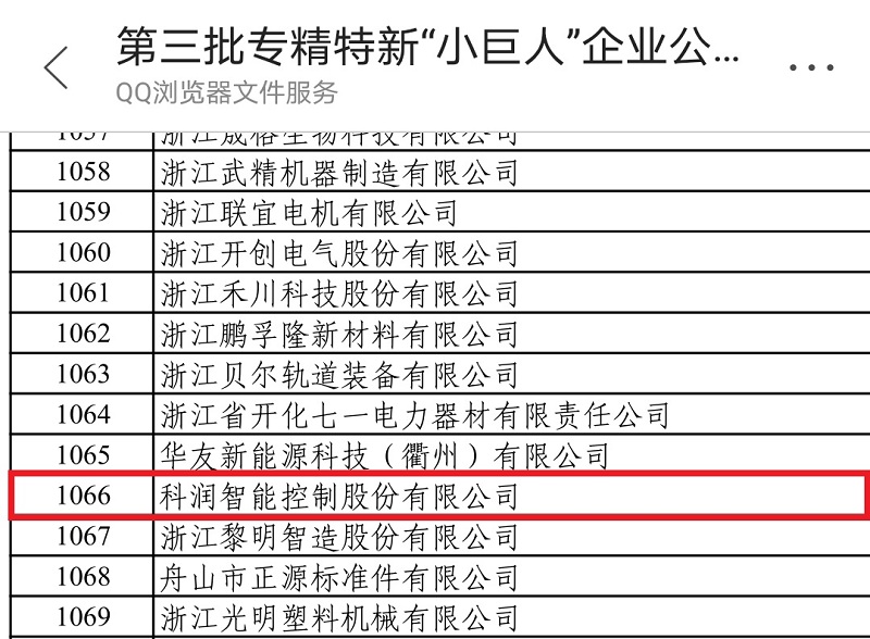 7月19日,工業(yè)和信息化部中小企業(yè)局公示第三批專精特新“小巨人”企業(yè)名單,公示期為7月19日至7月23日,科潤智能控制股份有限公司榜上有名。